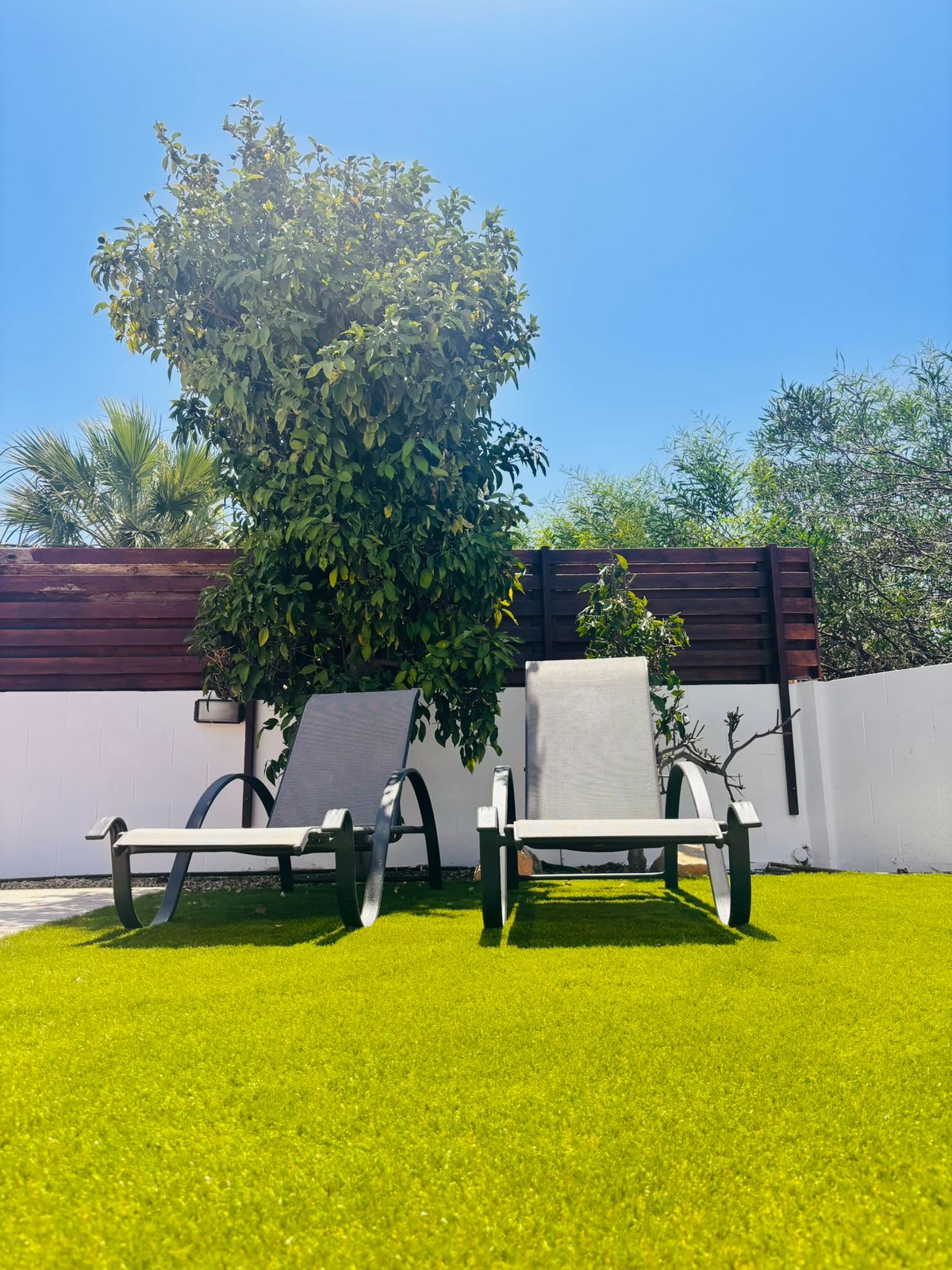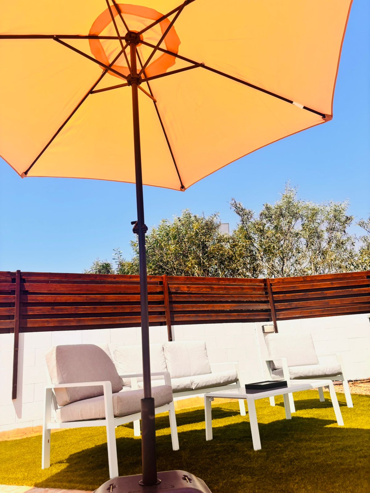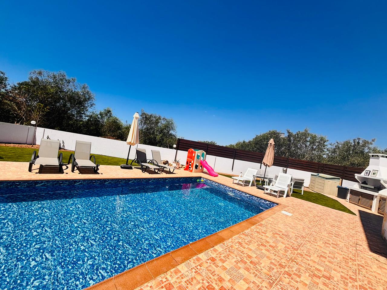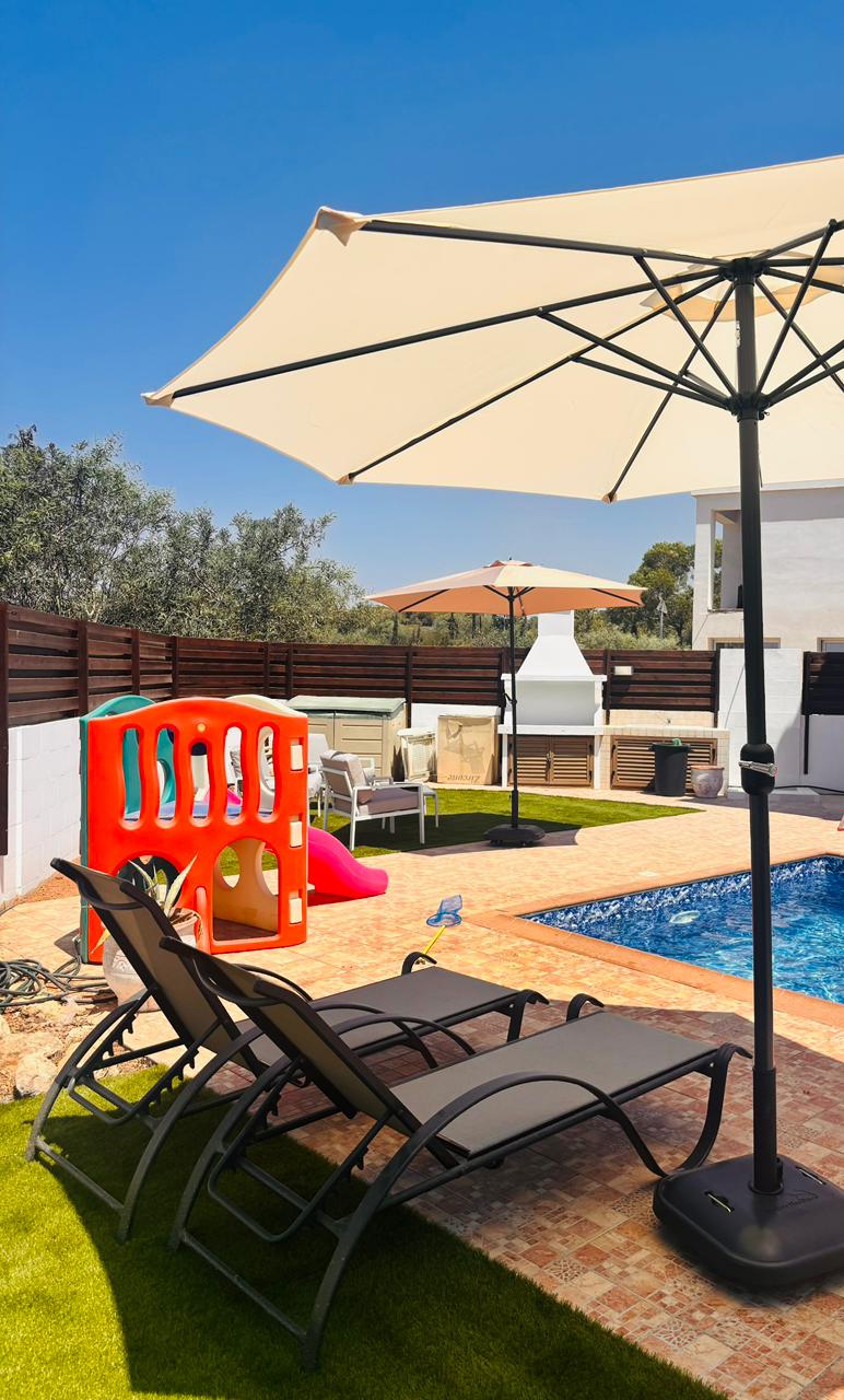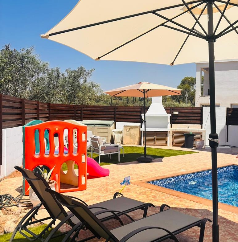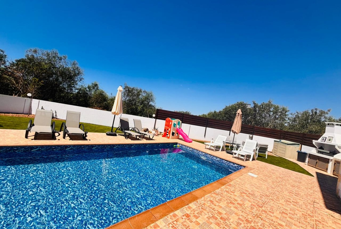 The property is fully air-conditioned with units in all rooms, ensuring comfort throughout the year. The bright and airy interior is complemented by large windows and sliding doors, bringing in natural light and offering views of the garden and pool area.