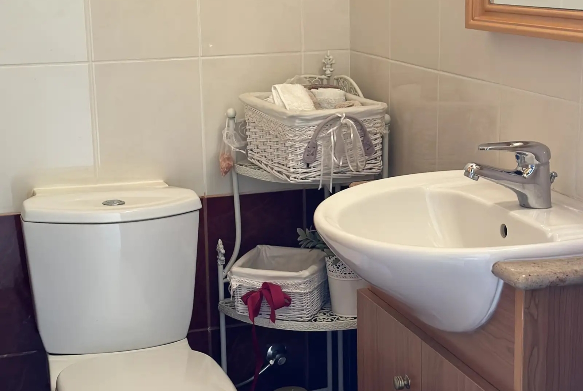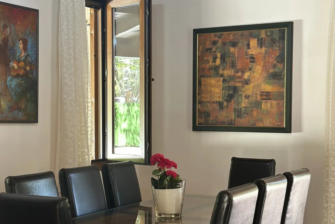 The house comes with full air conditioning in all rooms, ensuring comfort throughout the year. Additional features include a garden, a fireplace, a balcony, and a storage room, enhancing both indoor and outdoor living experiences. Parking is available with an uncovered space on the premises. While the energy efficiency rating is not available, the property has been maintained to a high standard.