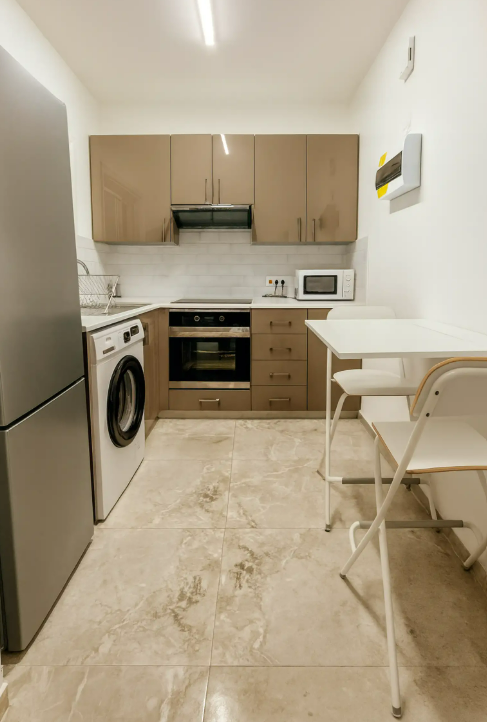 Open-plan kitchen with full equipment, washing machine & 50″ Android TV
