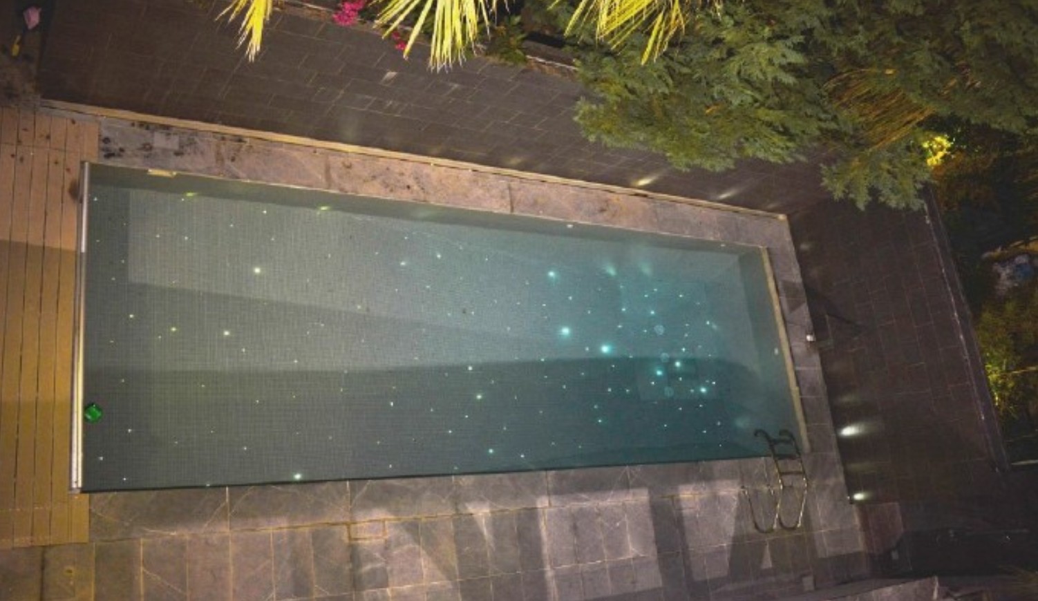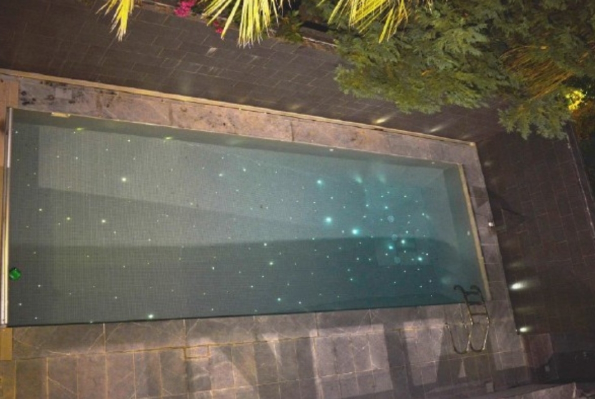 A salt-chlorinated swimming pool with grey puzzle ceramic finish, fiber optic color-changing lighting, waterfalls, and an electric/elastic cover.