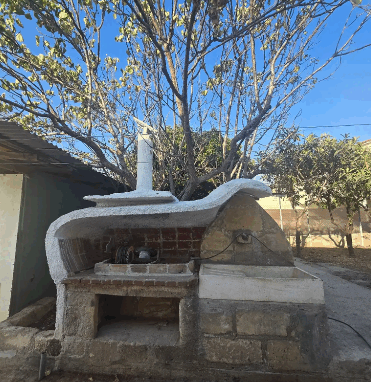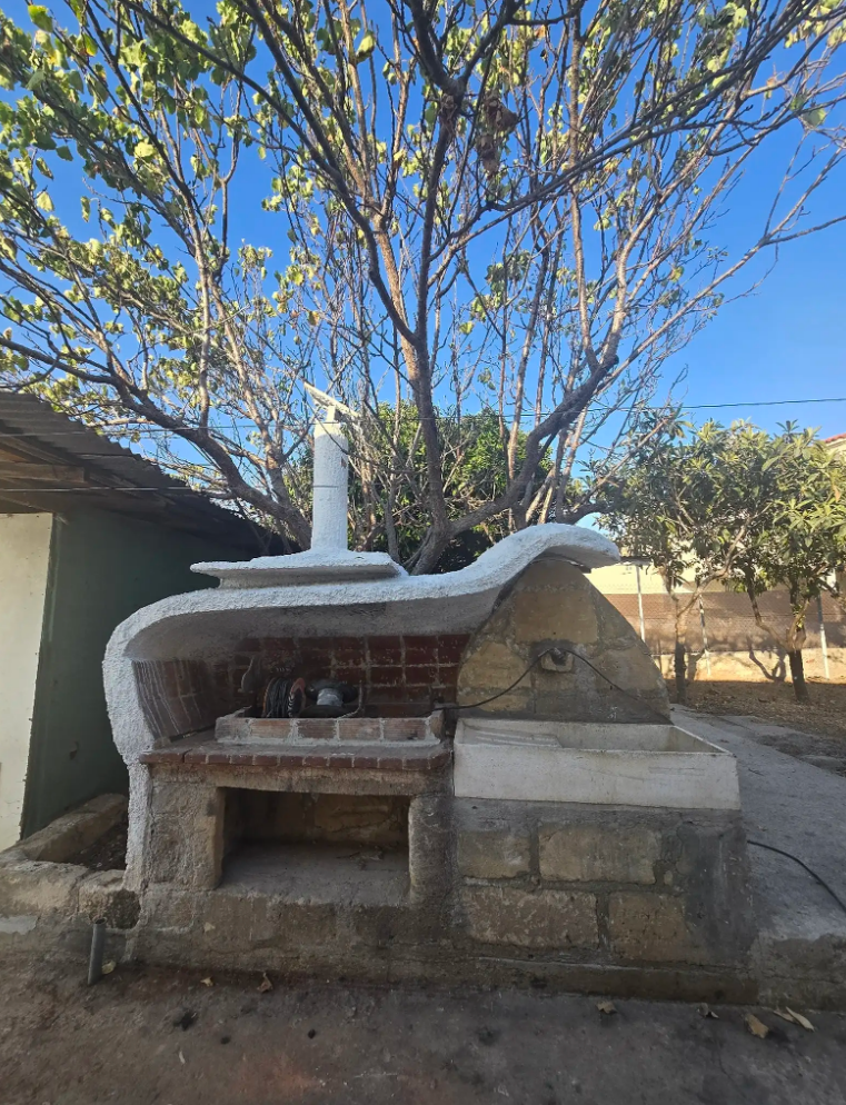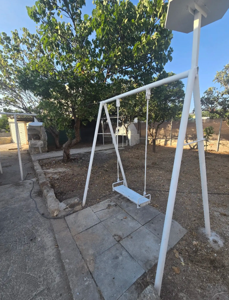 Outdoors, the property offers a large private garden with a swing, traditional oven, barbecue area, and storage room, creating a perfect space for relaxation and entertainment. The house also benefits from covered and uncovered parking options, including one closed garage, one covered, and two open spaces.