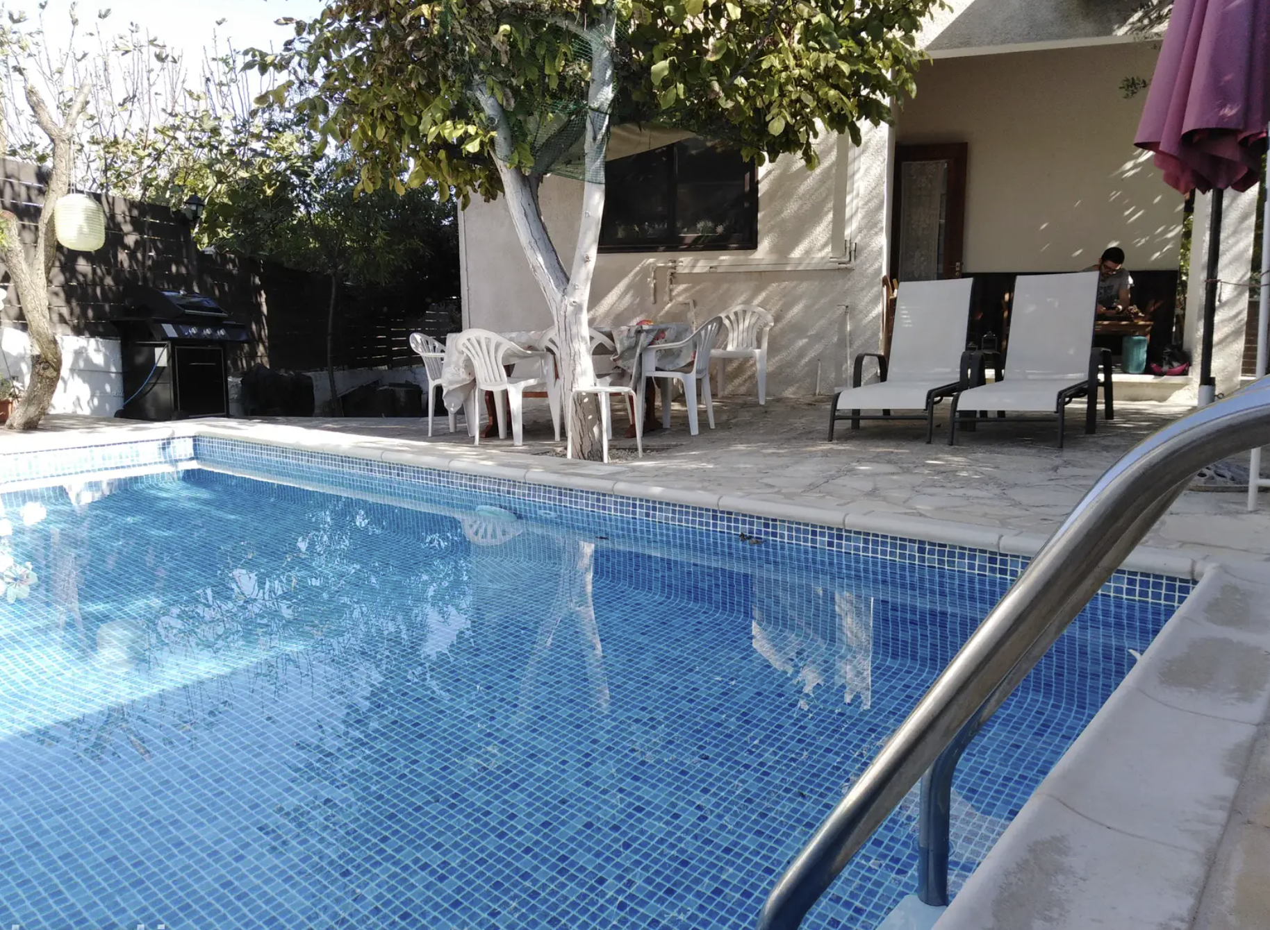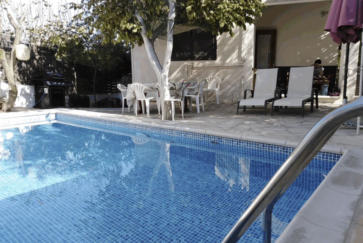 Outdoors, the property includes a garden, private pool, balcony, attic/loft, and a storage room. The house comes semi-furnished and includes full air-conditioning in all rooms, offering year-round comfort.