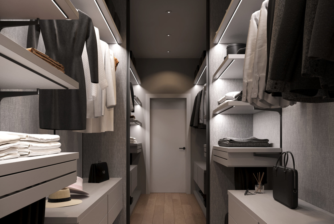 Storage: Wardrobes with matte lacquered doors and sleek black handles.