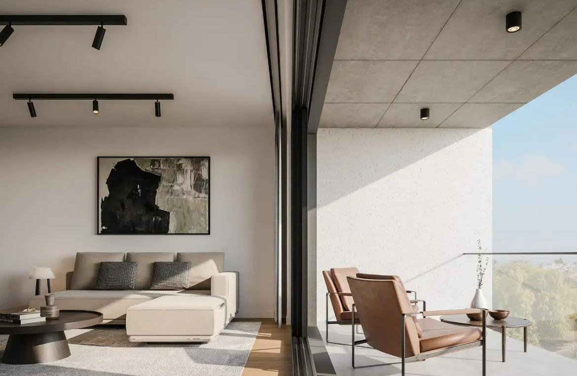 The apartment features a bright open-plan living and dining area, a modern kitchen, two well-proportioned bedrooms, and a spacious covered veranda ideal for relaxing or entertaining. Clean architectural lines, quality materials, and functional layouts create a refined and welcoming living environment.