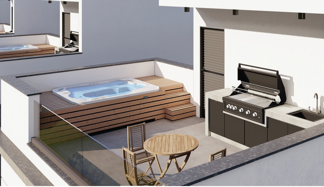 Outdoor living is a key highlight of the property. A private jacuzzi offers the perfect place to relax, while the beautifully designed roof garden provides an elevated retreat ideal for entertaining, dining, or enjoying the peaceful surroundings. The property also includes a storage room, uncovered parking, and the option to expand the outdoor experience with additional roof verandas of up to 32 m².