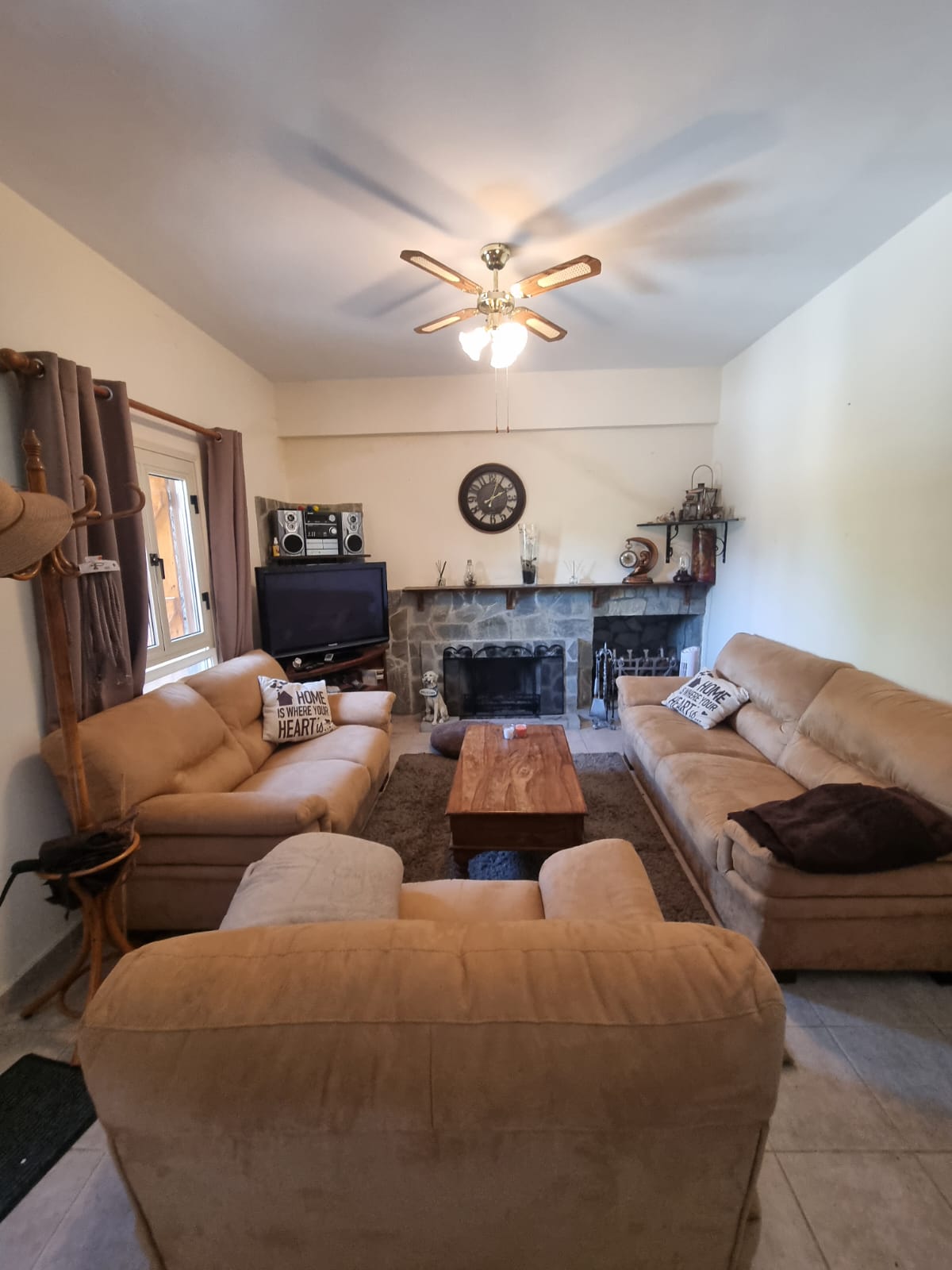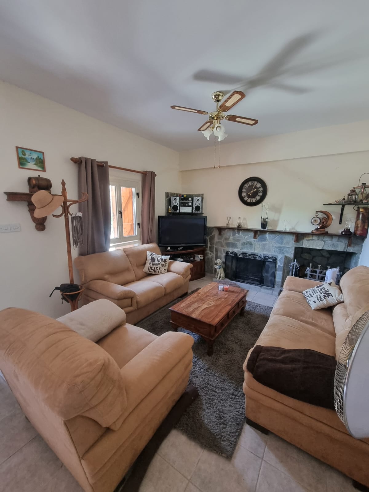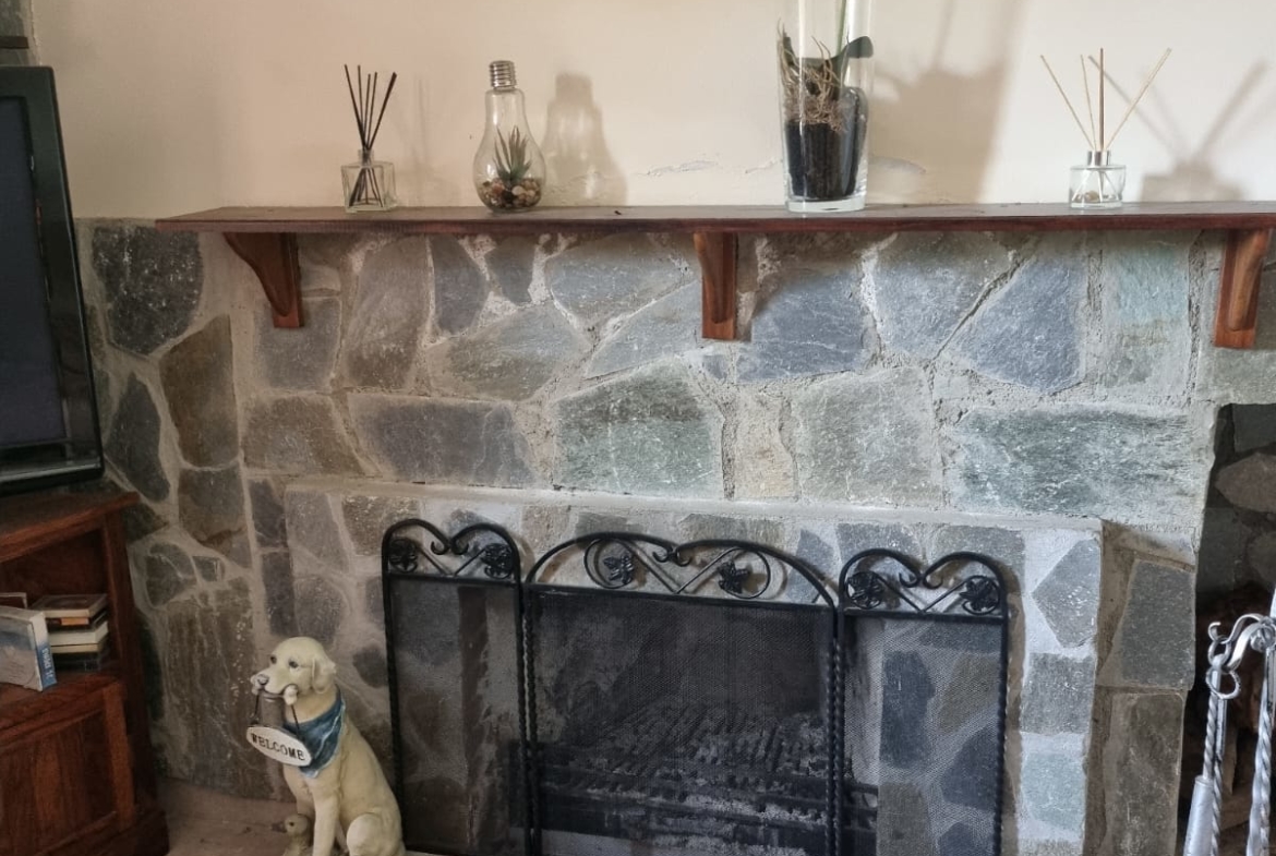 Inside, the home offers three well-proportioned bedrooms and two bathrooms, designed to provide both functionality and comfort. The inviting living area is complemented by a traditional fireplace, creating a warm and welcoming atmosphere during the cooler mountain months.